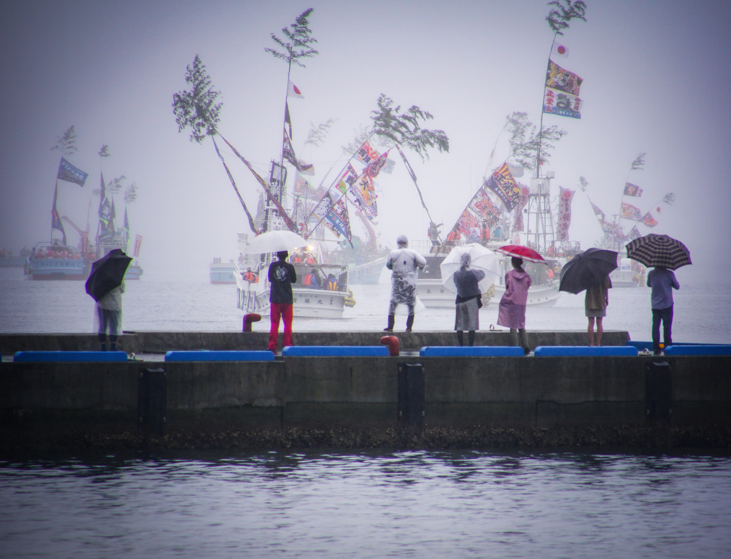 三陸復興国立公園は、人と自然との共生により育まれてきた暮らしと文化が感じられる国立公園です。親潮と黒潮が交わる好漁場として世界三大漁場の一つにも数えられ、漁業にまつわる暮らしや文化が各地で見られます。 写真は、大槌まつりの「曳き船」という行事で、地域の大漁と漁業の安全を願う祭りです。東日本大震災後8年ぶりに再開され、雨の中、出航する船と船を見守る姿からは地元の人々の勇気や喜びが伝わってきます。
