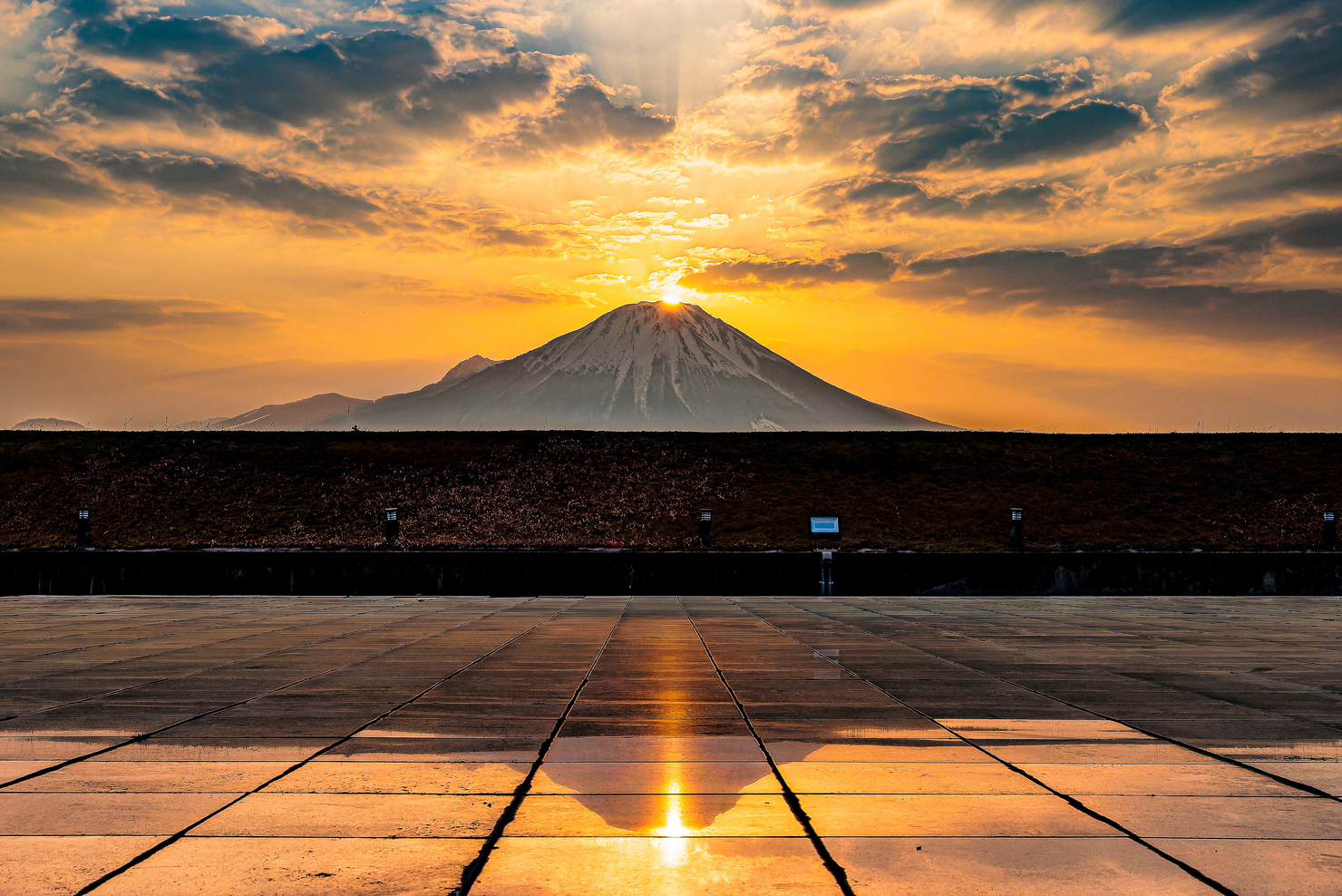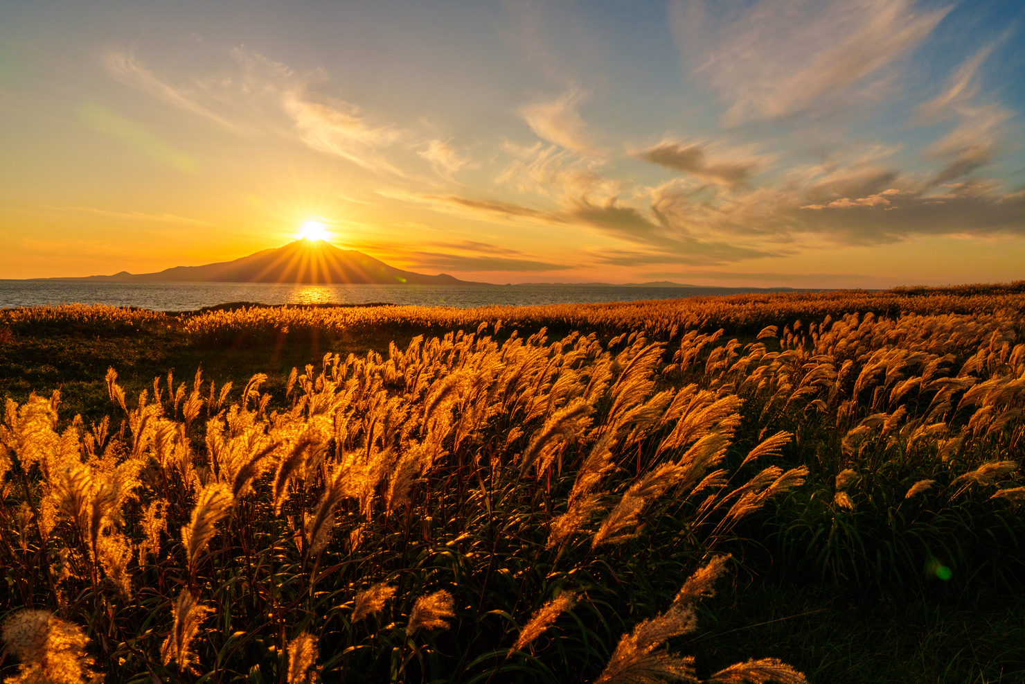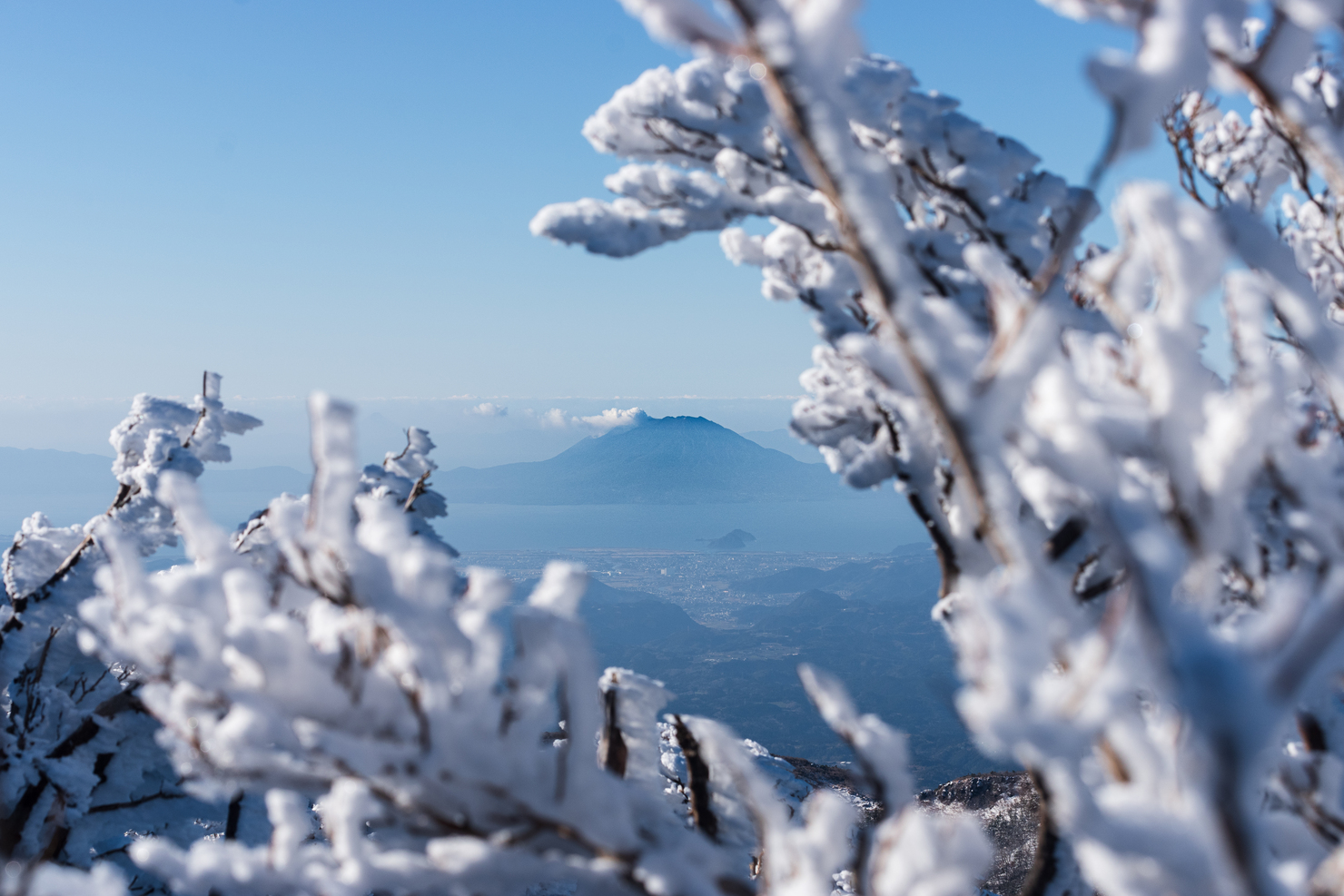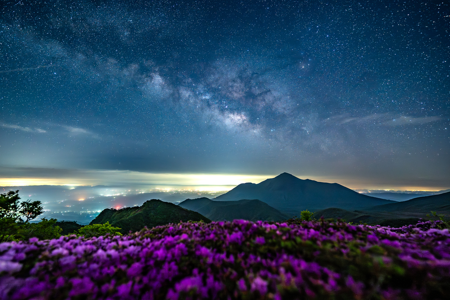 霧島錦江湾国立公園は霧島地域と錦江湾地域に区分され、活きた火山が造り上げた、特徴の異なる景観を有しています。 霧島地域は大小20以上の火山が連なる山岳地で、「火山地形の見本園」とも称されます。 鮮やかな紫紅色のミヤマキリシマの奥、一際高い山が、天孫降臨神話で有名な高千穂峰です。 北に位置する大幡山から撮影されたようで、霧島連山の雄大さや、火山の近くで営まれてきた人の暮らしが感じ取れる、素晴らしい一枚です。