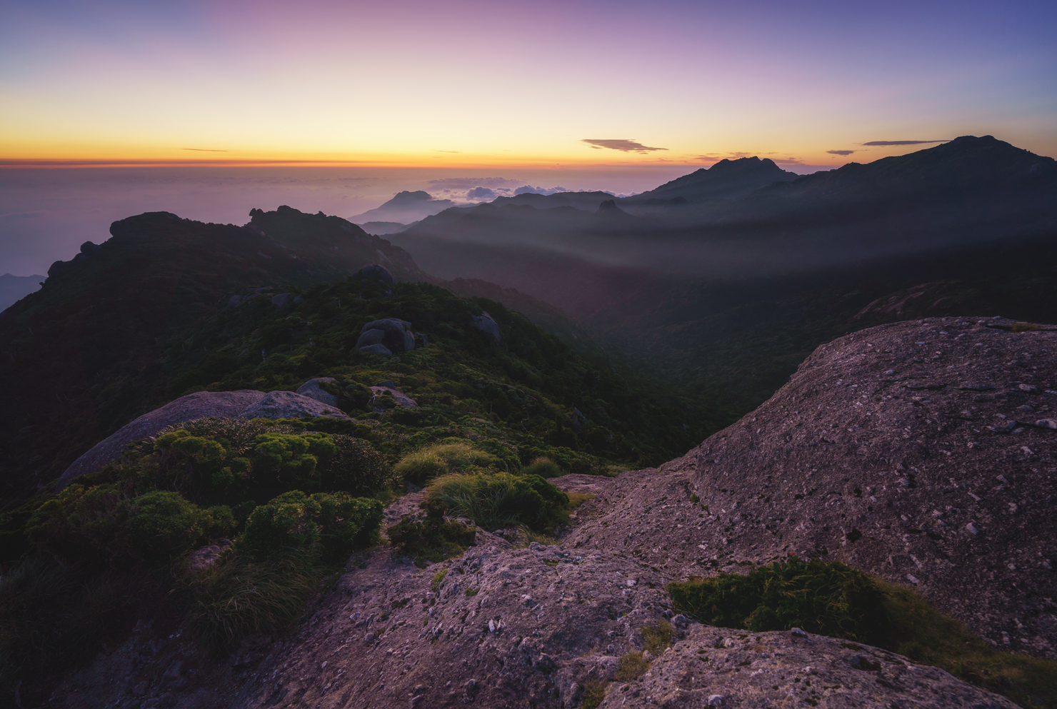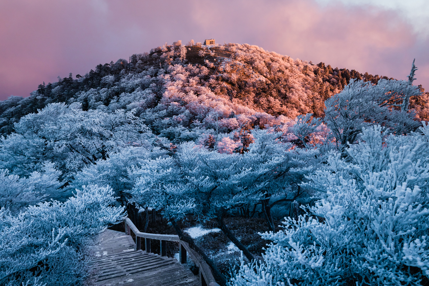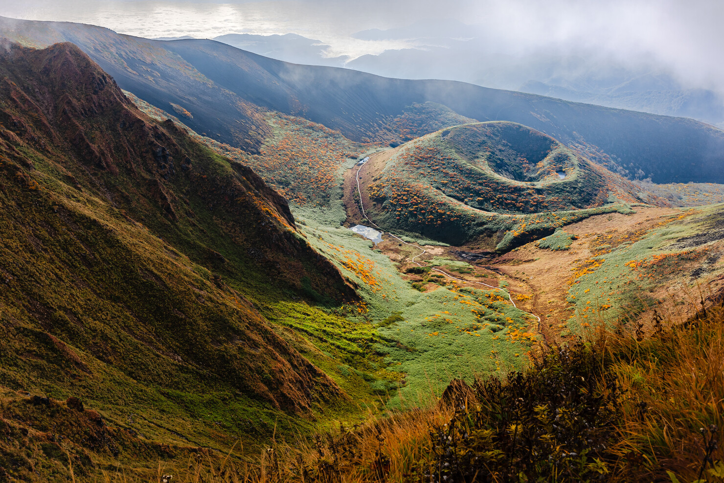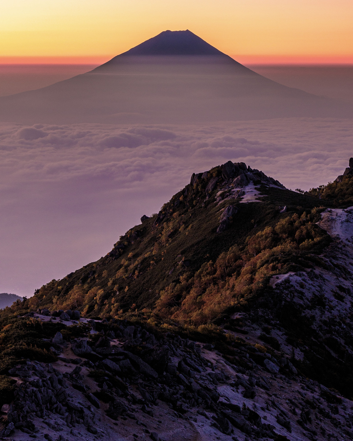 霧島錦江湾国立公園は霧島地域と錦江湾地域に区分され、活きた火山が造り上げた、特徴の異なる景観を有しています。 霧島地域は大小20以上の火山が連なる山岳地で、「火山地形の見本園」とも称されます。 鮮やかな紫紅色のミヤマキリシマの奥、一際高い山が、天孫降臨神話で有名な高千穂峰です。 北に位置する大幡山から撮影されたようで、霧島連山の雄大さや、火山の近くで営まれてきた人の暮らしが感じ取れる、素晴らしい一枚です。