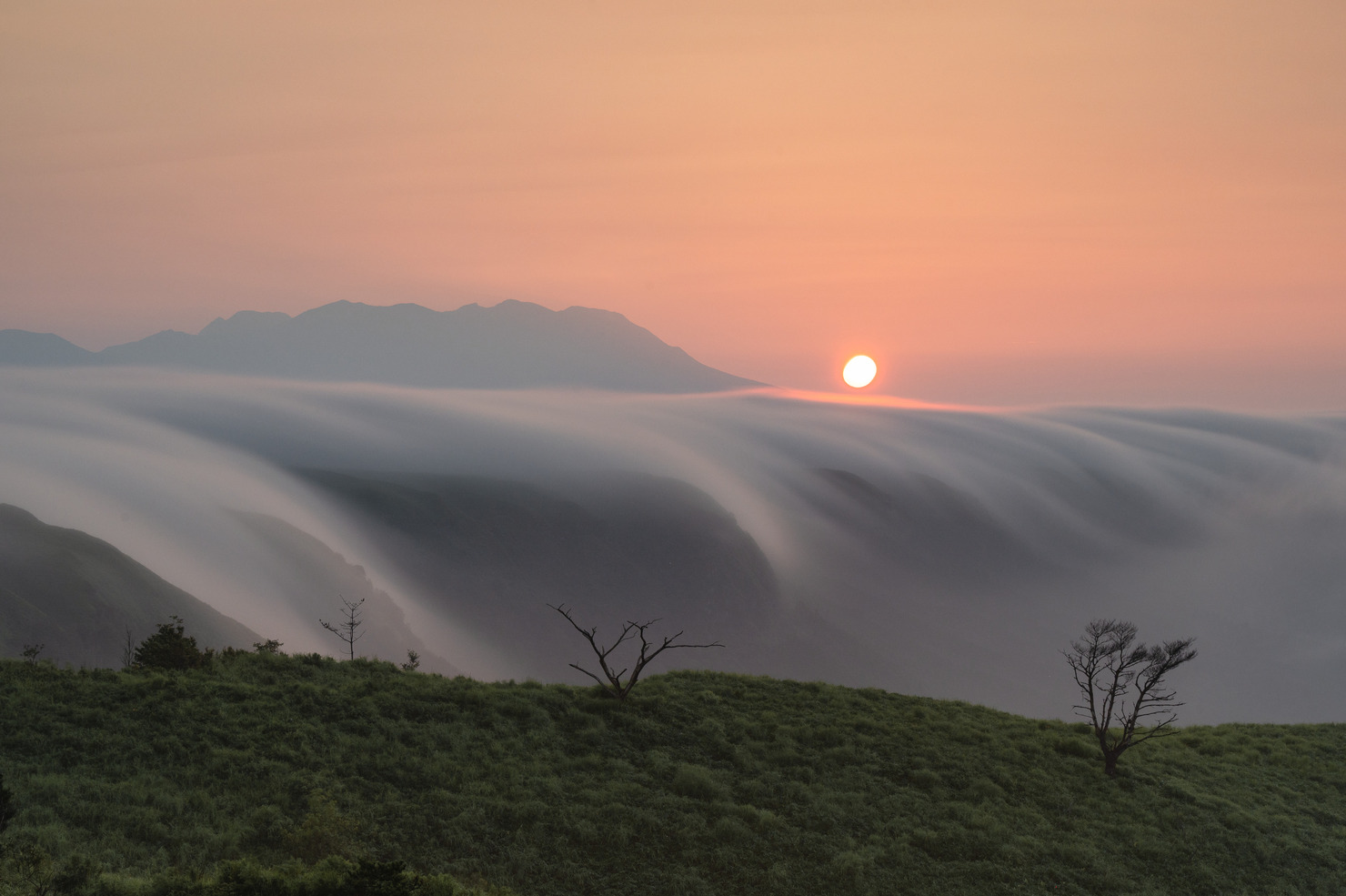 火山の噴気と温泉の湯気が立ちこめる、雲仙地獄の冬の朝。 東の空から昇ってきた太陽。 この自然のエネルギーを、皆さんもぜひご体感下さい。